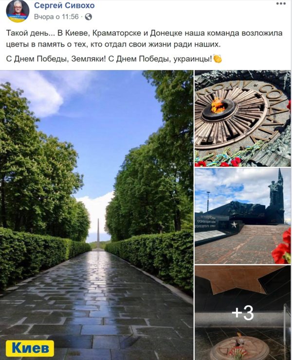“Такой день… В Киеве, Краматорске и Донецке наша команда возложила цветы в память о тех, кто отдал свои жизни ради наших. С Днем Победы, Земляки! С Днем Победы, украинцы!” — написал Сивохо.
