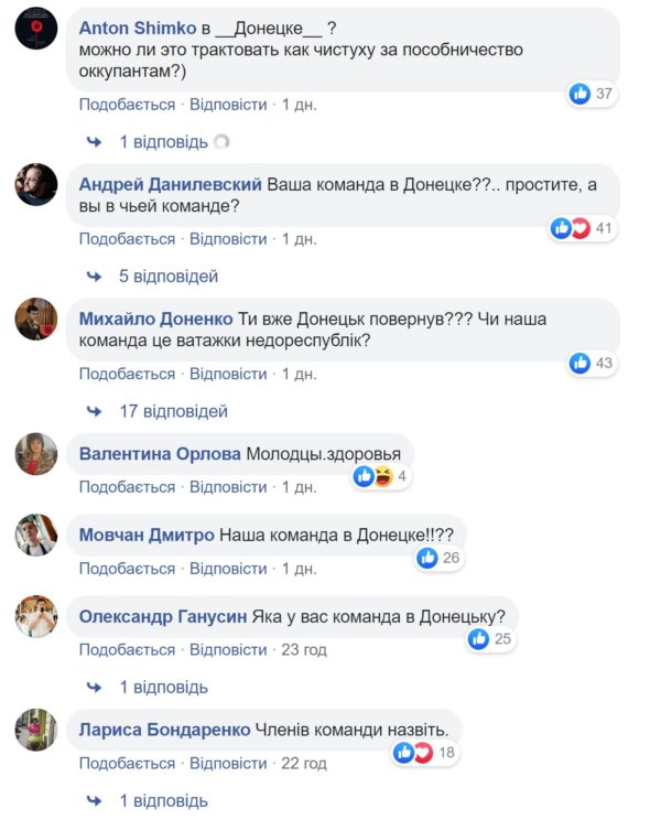 “В Донецке? Можно ли это трактовать как чистуху за пособничество оккупантам?”, “Ваша команда в Донецке??.. Простите, а вы в чьей команде?”, “Ты уже Донецк вернул ??? Или наша команда это главари недореспублик?”, “Наша команда в Донецке!!??”, “И в Донецке? Вместе с Пушилиным? Что ж ты ограничил возможность скрин разместить? Я б тебе фото с Пушилиным в Донецке приэттачила”, – пишут украинцы под постом Сивохо.