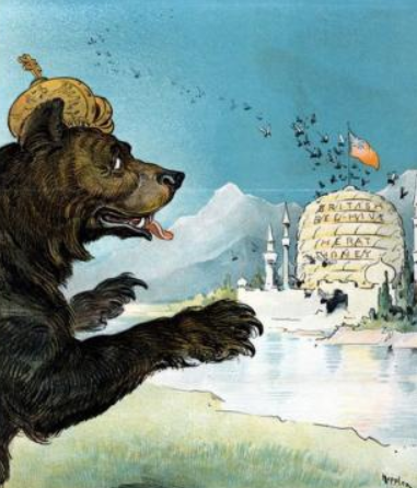 У кінці ХІХ – початку ХХ століття по всьому світі у політичній карикатурі починають масово зображати Російську імперію у вигляді ведмедя. Цим автори хотіли підкреслити грубість та недолугість росіян. Бо саме цей хижак часто у казках є символом тупості й незграбності. Ця тварина любить залякувати інших своєю силою.