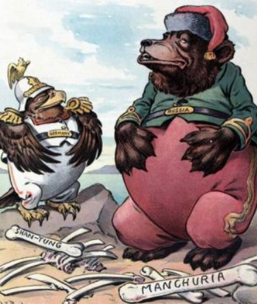 Ще одна понад столітня яскрава карикатура на Російську імперію. На ній німецький орел і російський ведмідь відпочивають після трапези в Китаї. Її назва “Хто перший прийшов – той перший обслуговується”. Росія їсть з миски з написом “Маньчжурія” в китайському ресторані. Малюнок створили у 1903 році.
