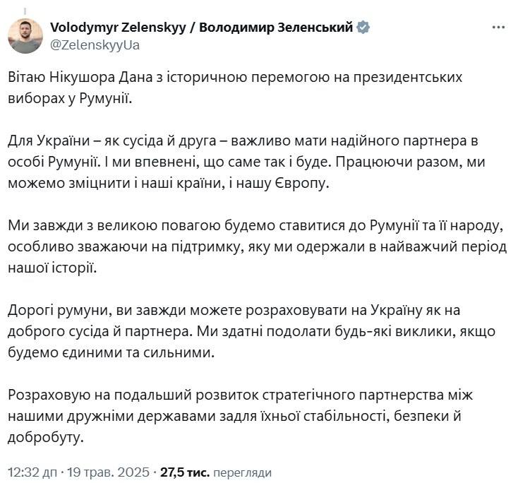 Володимир Зеленський вже привітав Нікушора Дана з перемогою.