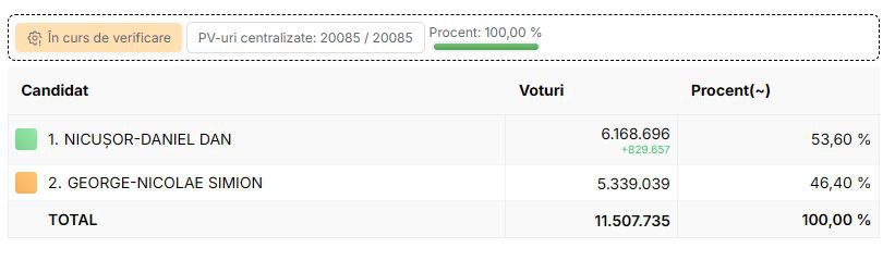 Після підрахунку 100% бюлетенів, мер Бухаресту Нікушор Дан переміг на виборах президента Румунії із результатом 53,60%.