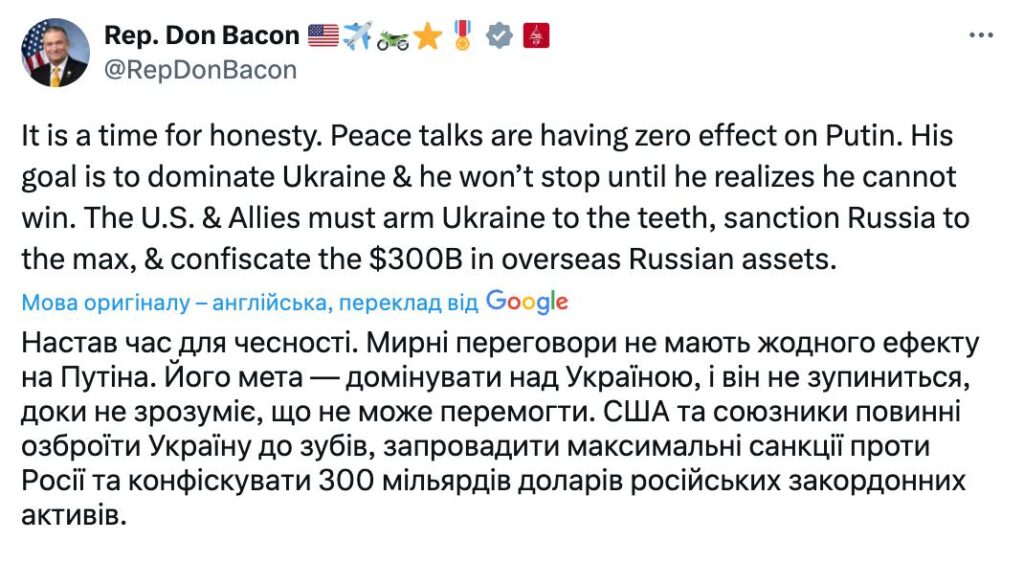 Після російської нічної атаки варто відкинути ідею мирних переговорів та перейти до рішучих дій, бо мирні переговори не вплинуть на Путіна, – так конгресмен-республіканець Дон Бейкон відреагував на атаки Росії по Україні.