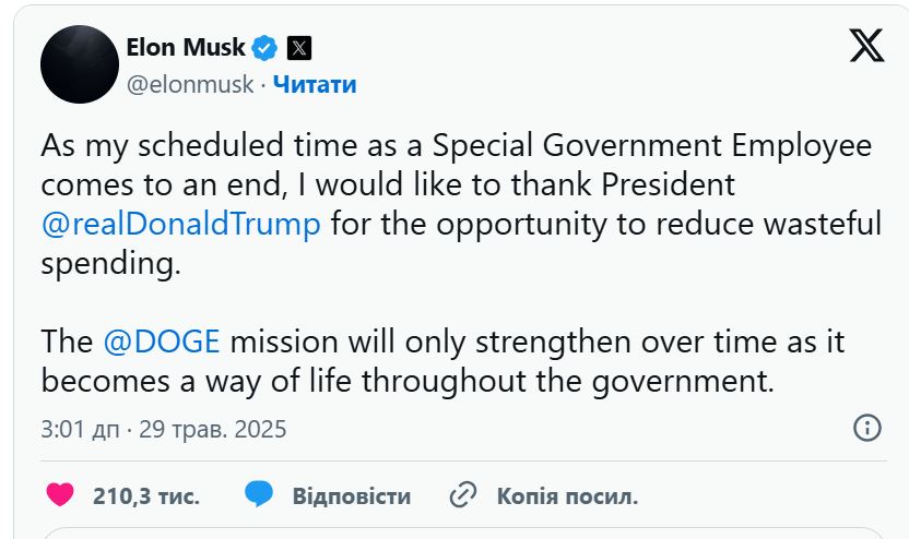“Оскільки мій запланований термін на посаді спеціального урядового службовця добігає кінця, я хотів би подякувати президенту Трампу за можливість зменшити марнотратні витрати. Місія DOGE (відомства з підвищення ефективності роботи американського уряду — Ред.) з часом лише посилюватиметься, оскільки вона стане способом життя всього уряду”, — написав Маск.