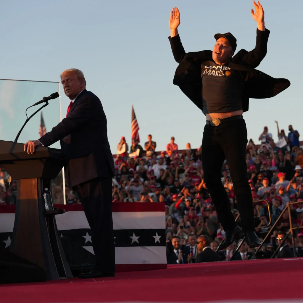 5 жовтня він вперше з’явився з Трампом на мітингу, підстрибуючи навколо кандидата. Того ж вечора Маск поділився своїм хвилюванням з близькою йому людиною. «Я відчуваю себе більш оптимістично після сьогоднішнього вечора, – написав він у текстовому повідомленні. «Завтра ми розкриємо аномалію в матриці».