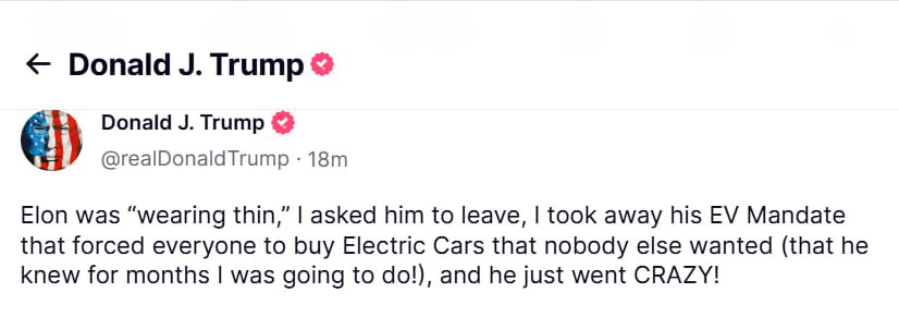 “Ілон «почав втомлювати», я попросив його піти, я скасував його мандат на електромобілі, який змушував усіх купувати електрокари, які нікому більше не були потрібні (а він знав протягом кількох місяців, що я це зроблю!), і він просто ЗБОЖЕВОЛІВ!, — президент США Трамп у власній соціальній мережі Truth Social.