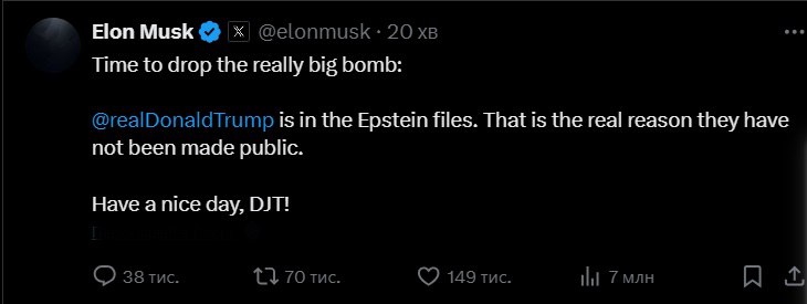 Маск фактично звинуватив президента США у чергових кримінальних злочинах, натякаючи на педофелію.