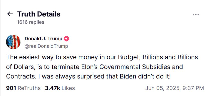 “Найпростіший спосіб заощадити кошти в нашому бюджеті — мільярди й мільярди доларів — це припинити державні субсидії та контракти для Ілона. Я завжди дивувався, чому Байден цього не зробив!”, – додав він.