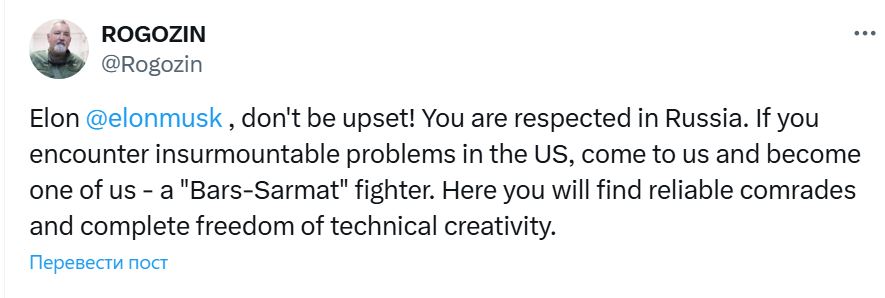 «Ілоне, не засмучуйся! Тебе поважають у Росії. Якщо в США у тебе виникнуть непереборні проблеми, приходь до нас і стань одним із нас – бійцем «Барс-Сармат». Тут ти знайдеш надійних товаришів і повну свободу технічної творчості. Питання громадянства і військового квитка ми, звісно, вирішимо», – написав Рогозін в X і залишив посилання на підписання контракту.