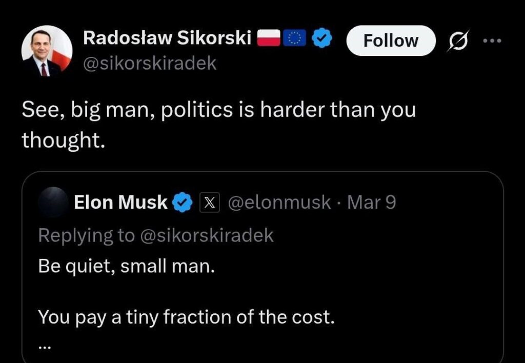 Таким чином дипломат пригадав Маску його зневажливі коментарі, які той робив у минулому. У березні бізнесмен пригрозив відключенням Starlink для України. Сікорський відповів, що саме Польща платить 50 млн доларів на рік за термінали для українських військових і може знайти інших постачальників аналогічних послуг. Маск назвав польського міністра “маленькою людиною” і заявив, що “Starlink неможливо замінити”.