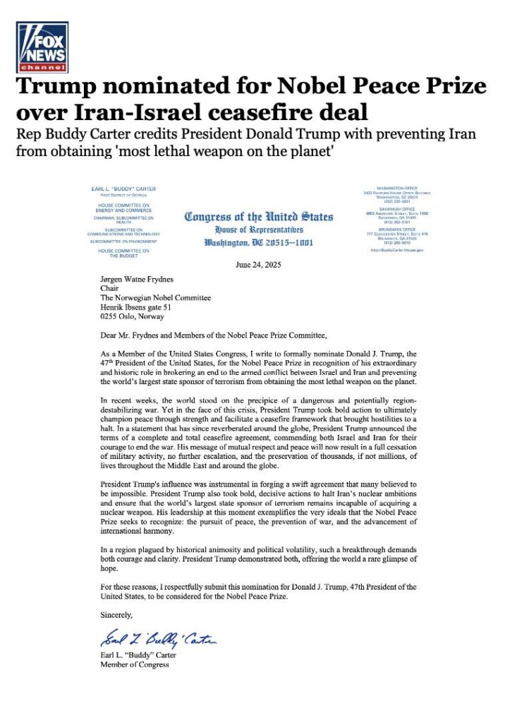 З цих причин я з усією повагою висуваю кандидатуру Дональда Трампа, 47-го президента Сполучених Штатів, на здобуття Нобелівської премії миру.