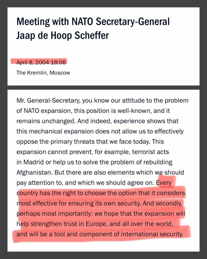 -Російська брехня про розширення НАТО як «причину» агресії проти України не витримує критики. Особливо, коли зіштовхуєшся з власними словами Путіна, сказаними ним у 2004 році. Кремлівські архіви викривають лицемірство.
