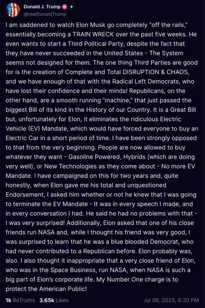 Мені сумно спостерігати за тим, як Ілон Маск повністю “злетів з котушок” і за останні п’ять тижнів перетворився на справжню КАТАСТРОФУ, — президент США Дональд Трамп про колишнього поплічника.