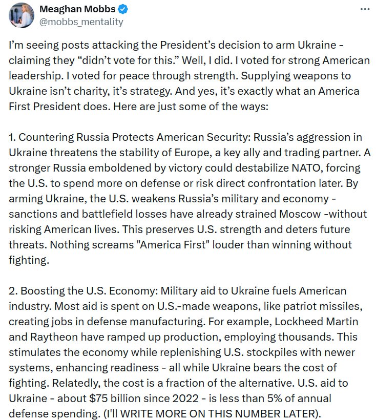 -Я бачу дописи, в яких критикують рішення президента Трампа озброїти Україну, і твердження “ми за це не голосували”. А я голосувала. Я голосувала за сильне американське лідерство, за мир через силу.