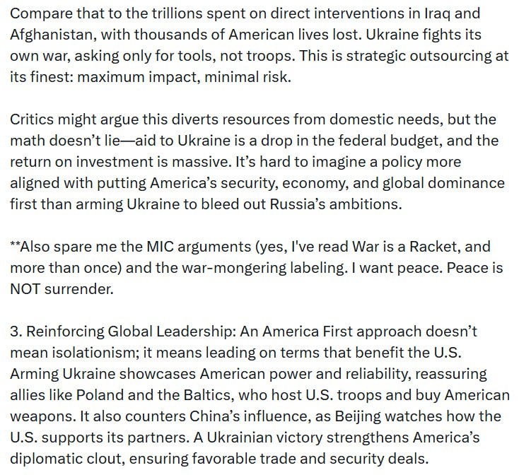 Важко уявити політику, яка б більше відповідала пріоритетам безпеки, економіки та глобального домінування Америки, ніж озброєння України для знекровлення амбіцій росії.