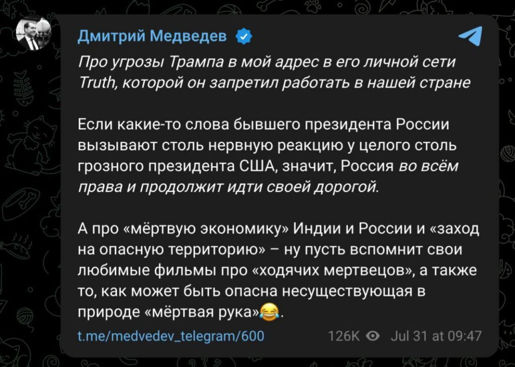 Але Мєдвєдєв продовжує знущатися з Трампа, бо інакше як знущанням його новий допис назвати не можна.
