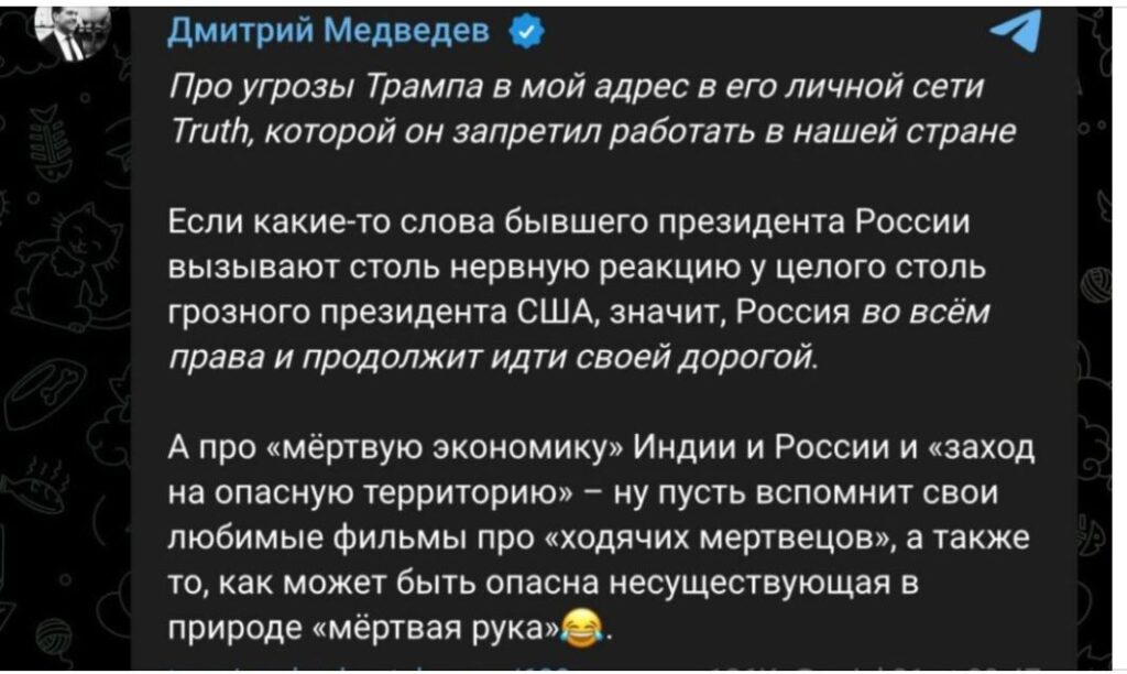 Нагадаємо, Мєдвєдєв посміявся з попередження Трампа – назвав Америку “ходячими мерцями” і написав таке: