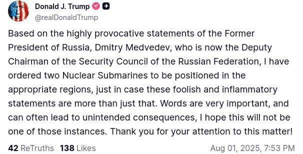 У зв’язку з провокаційними заявами Мєдвєдєва я віддав розпорядження розмістити два атомні підводні човни у відповідних районах на випадок, якщо ці безглузді слова виявляться чимось більшим, ніж риторикою, — написав Трамп.