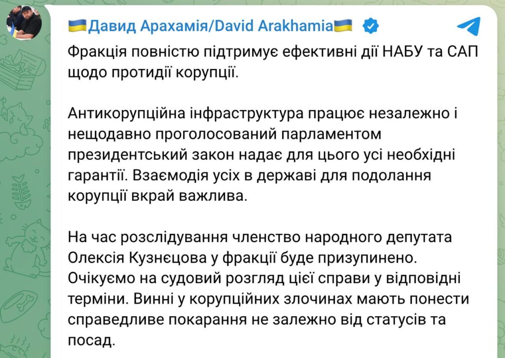 Голова фракції заявив, що на час розслідування справи НАБУ та САП щодо народного депутата Олексія Кузнєцова, його членство у фракції буде призупинено.