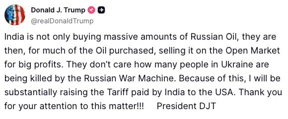 «Індія не лише закуповує величезну кількість російської нафти, а й перепродає значну її частину на відкритому ринку, отримуючи при цьому великий прибуток. Їх не хвилює, скільки людей в Україні гине від російської воєнної машини. У зв’язку з цим я суттєво збільшу мита, які Індія платить США», — заявив Трамп.