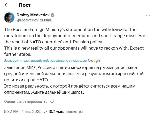 Це перший пост Дмитра Медведєва з 31 липня, коли він у своїй відповіді Дональду Трампу згадав «Мертву руку» – автоматичну систему відповідного ядерного удару «Периметр». Після чого президент США наказав розмістити дві атомні субмарини «у відповідних місцях».