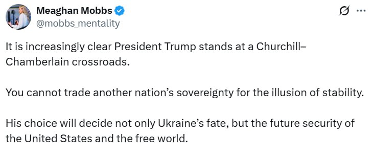 -Дедалі більш очевидно, що президент Трамп стоїть на роздоріжжі Черчилля і Чемберлена. Не можна обмінювати суверенітет іншої країни на ілюзію стабільності. Його вибір визначить не лише долю України, але й майбутню безпеку США і вільного світу, – написала донька спецпредставника США Келлога Меган Моббс.