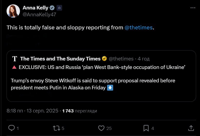 “Це абсолютно неправдива й недбало зроблена публікація від The Times”, – написала у Х заступниця прессекретаря Білого дому Анна Келлі.