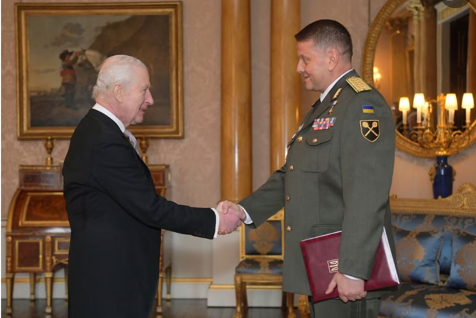 Залужний потискає руку Чарльзу Валерій Залужний, посол України у Великій Британії, зустрічається з королем Чарльзом під час приватної аудієнції в Букінгемському палаці в лютому. Фото: Yui Mok/AP