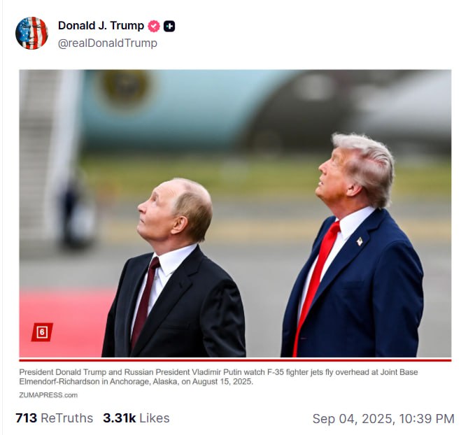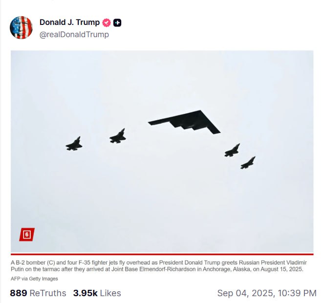 Трамп після розмови з європейськими лідерами розмістив у своїй соцмережі Truth Social спільне фото з Путіним, зроблене на саміті на Алясці. Тоді президент США демонстрував російському диктатору американський малопомітний стратегічний бомбардувальник B-2 Spirit, у супроводі чотирьох F-35.