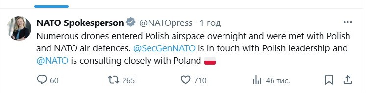 «Численні безпілотники вночі увійшли до польського повітряного простору та були зустрінуті польськими та натівськими засобами протиповітряної оборони.