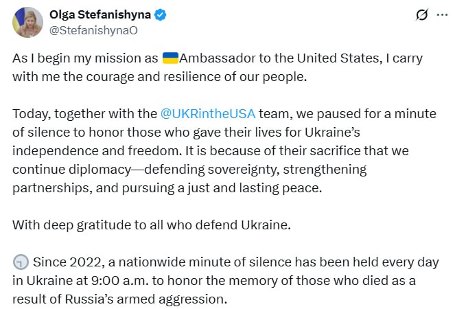 Сьогодні разом із українською командою в США ми зупинилися на хвилину мовчання, щоб вшанувати тих, хто віддав своє життя за незалежність і свободу України. Саме завдяки їхній жертві ми продовжуємо дипломатію — захищаючи суверенітет, зміцнюючи партнерства та прагнучи справедливого й тривалого миру», — заявила Стефанішина.