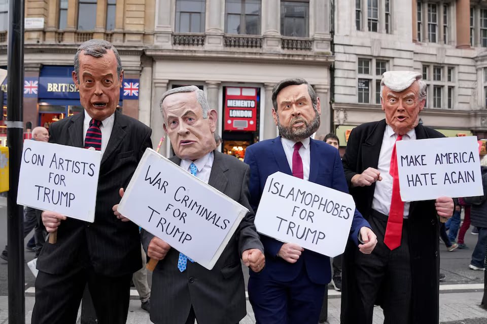 Протестувальники з плакатами «Народ Великої Британії не вітає фашиста Трампа», «Ні расизму, ні Трампу», «Мігранти — ласкаво просимо, Трамп — ні», прапорами Палестини та іншою атрибутикою вигукували гасла та закликали політика залишити Сполучене Королівство. Деякі учасники акції принесли на акцію надувні фігури Трампа і м’ячі з обличчям Джей Ді Венса.