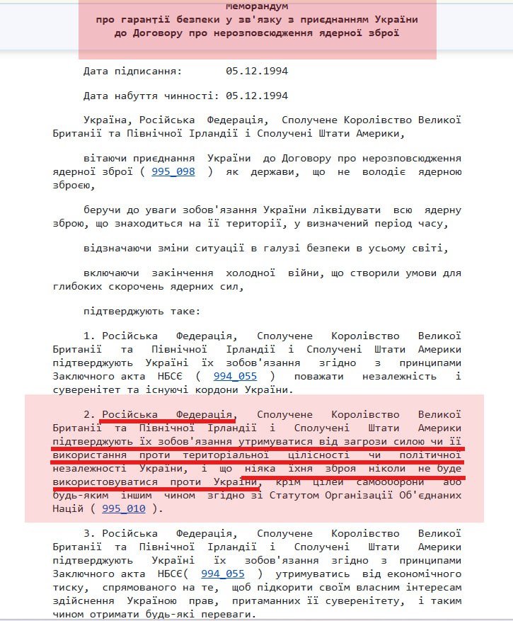 Російська федерація, Сполучене Королівство Великобританії та Північної Ірландії та Сполучені Штати Америки підтверджують свої зобов’язання утримуватися від загрози силою або її застосування проти територіальної цілісності чи політичної незалежності України, і що жодна їхня зброя ніколи не буде використана проти України, крім як з метою самооборони.
