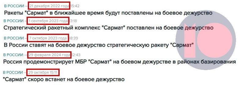 Лютий 2024, Путін: «До військ поставлені і перші серійні важкі балістичні ракети «Сармат». Ми скоро продемонструємо їх в районах базування на бойовому чергуванні».