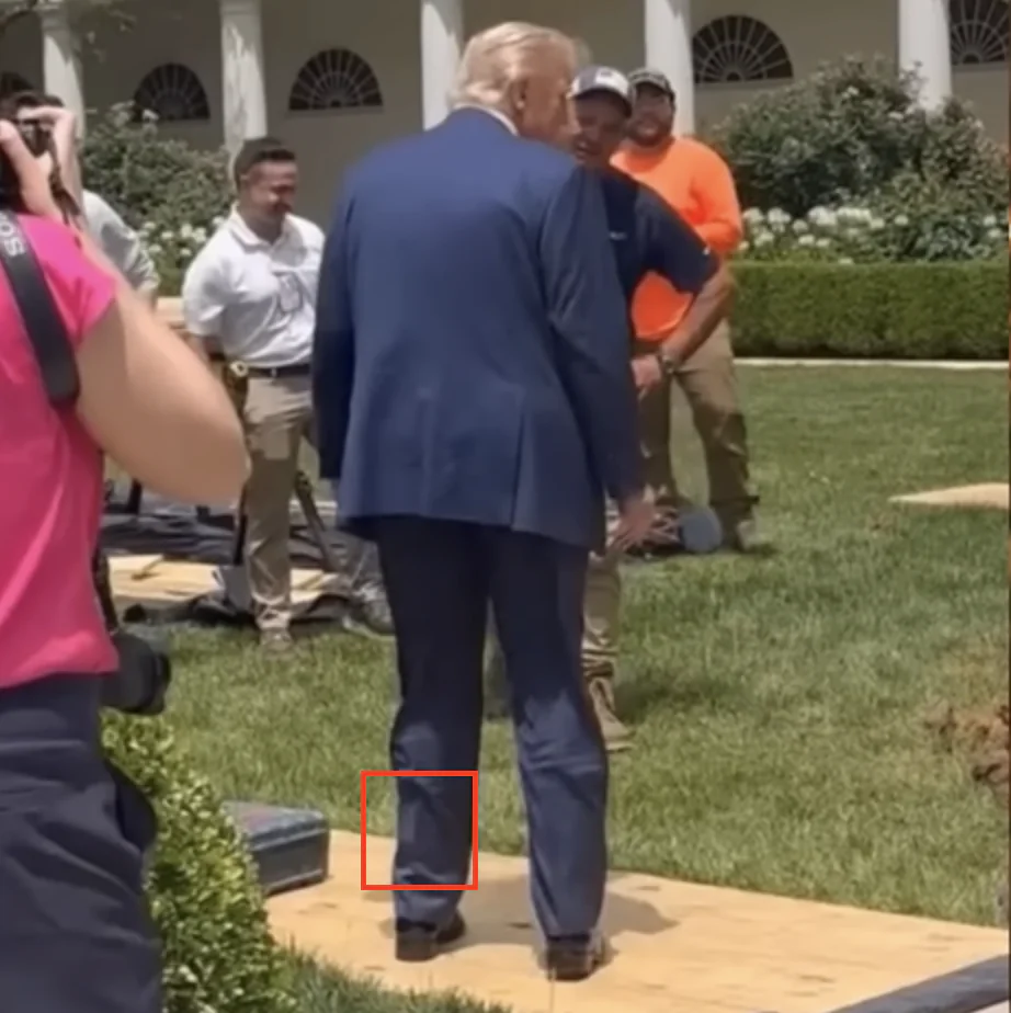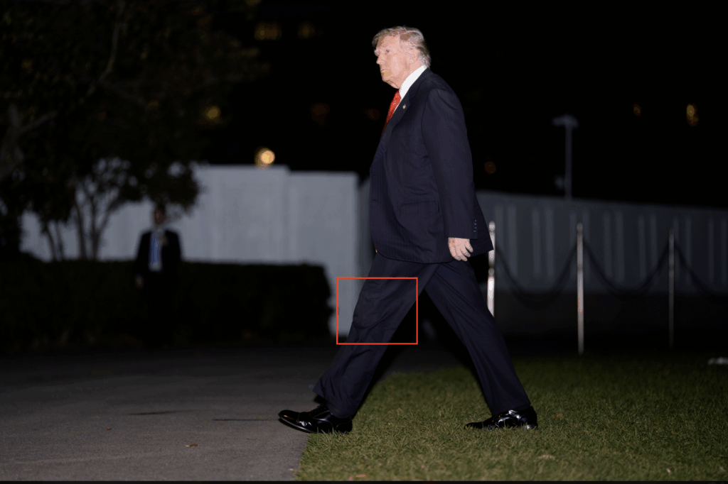 Як видно на нових фото Трампа, під час його пересування на лівій нозі нібито сфотографували дивне випинання. На штанині зліва в ділянці стегна помітно щось схоже на мішечок.