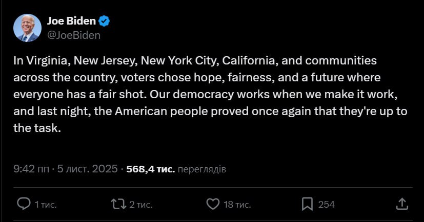 “У Вірджинії, Нью-Джерсі, Нью-Йорку, Каліфорнії та громадах по всій країні виборці обрали надію, справедливість і майбутнє, у якому кожен має рівні можливості”, — так 46-ий президент Сполучених Штатів Джо Байден відреагував на перемогу представників Демократичної партії над республіканцями на місцевих виборах.