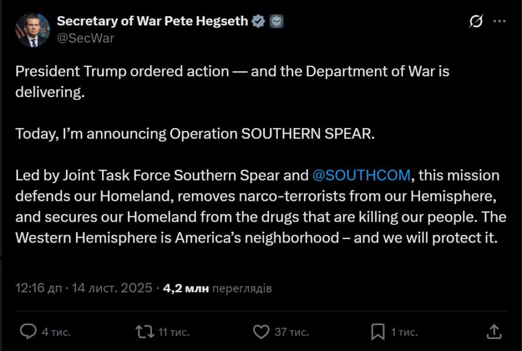 -Під керівництвом Об’єднаної оперативної групи Southern Spear та Командування Збройних сил США у Південній Америці (SOUTHCOM) ця місія захищає нашу Батьківщину, усуває наркоторористів із нашої півкулі й убезпечує нашу країну від наркотиків, які вбивають наших громадян. Західна півкуля — це американський сусідський простір, і ми його захищатимемо.