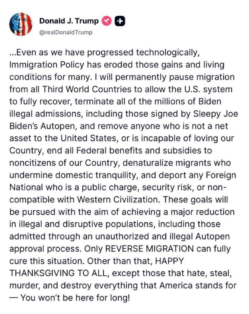 “Незважаючи на наш технологічний прогрес, імміграційна політика підірвала ці досягнення та погіршила умови життя багатьох людей. Я на постійній основі призупиняю міграцію з усіх країн третього світу, щоб система США могла повністю відновитися, скасую всі мільйони незаконних допусків Байдена, включаючи ті, що були підписані авторучкою Сонного Джо Байдена, і вишлю всіх, хто не є чистим активом для Сполучених Штатів або не здатний любити нашу країну, припиню всі федеральні пільги та субсидії для негромадян нашої країни, позбавлю громадянства мігрантів, які підривають внутрішній спокій, і депортую всіх іноземних громадян, які є тягарем для суспільства, загрозою безпеці або несумісні із західною цивілізацією.