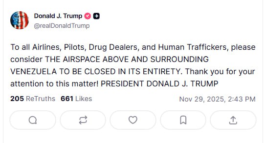 “До всіх авіакомпаній, пілотів, наркоторговців та торговців людьми, будь ласка, врахуйте, що ПОВІТРЯНИЙ ПРОСТІР НАД ВЕНЕСУЕЛОЮ ТА НАВКОЛО НЕЇ ПОВНІСТЮ ЗАКРИТО. Дякуємо за вашу увагу до цього питання! ПРЕЗИДЕНТ ДОНАЛЬД ДЖ. ТРАМП”.