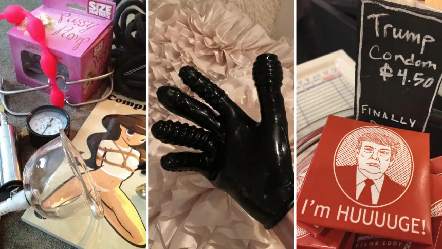 Ці гумки, біля яких стоїть табличка «Trump condom $4.50», виготовив нью-йоркський магазин сувенірів Fishs Eddy. В онлайн-колекції Національного музею американської історії цей виріб описано як «політичний сатиричний презерватив».