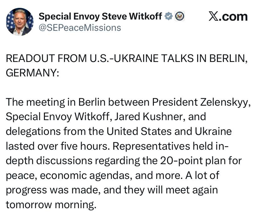 Під час сьогоднішніх перемовин у Берліні вдалося досягти значного прогресу. Так вважає спецпосланець Трампа Віткофф, про що він і заявив на своїй сторінці у соцмережі Х після зустрічі з українською делегацією.