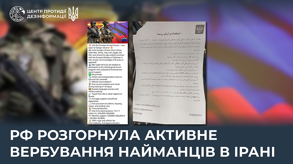 У низці міст Ірану масово з’явилися листівки з пропозицією приєднатися до війська рф за гроші: $20 тис. «підйомних» і приблизно $2 тис. щомісяця. Оголошення ведуть до Telegram-каналу, створеного в листопаді 2025 року, де вербування здійснюється кількома мовами. Рекрутер, з яким поспілкувалися журналісти, прямо заявив, що кампанія координується російською стороною на території Ірану.