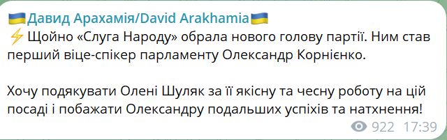 Нагадаємо, що Олександр Корнієнко вже очолював партію – листопада 2019 року до листопада 2021 року.