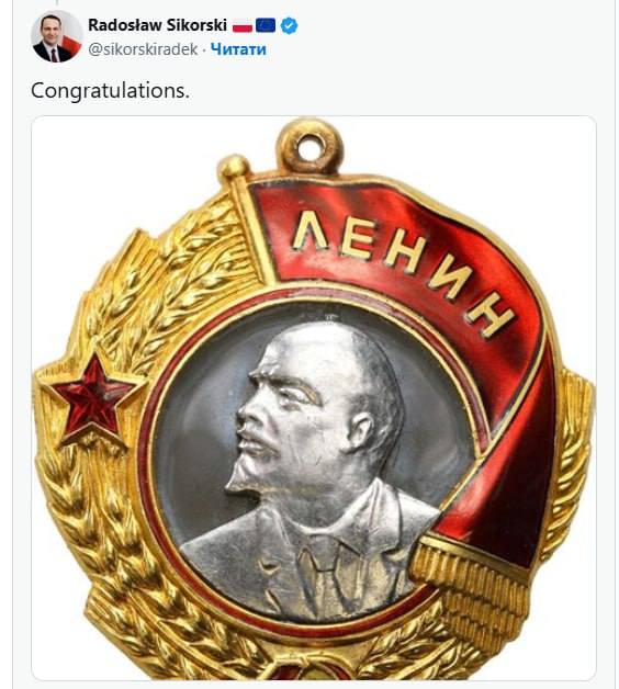 Сікорський написав “Вітаю”, додавши фотографію ордену Леніна.
