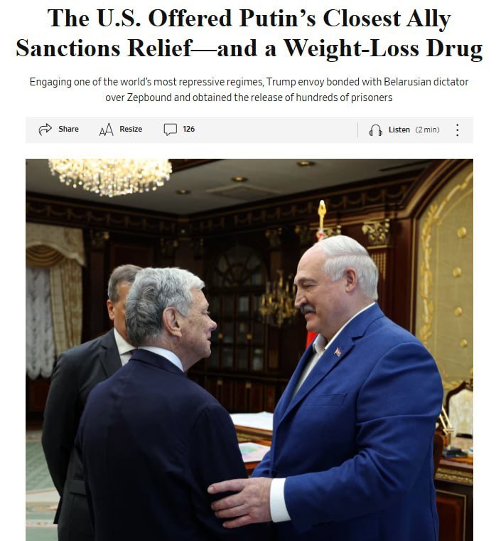 WSJ пише, що на тлі цих контактів Білорусь звільнила понад 250 політв’язнів із різних країн. А у США вирішили вивчити можливість постачання Zepbound особисто для Лукашенка. Втім, судячи з його зовнішнього вигляду, препарати ще в дорозі.