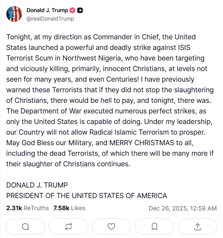 -Сьогодні ввечері, за моїм наказом як Головнокомандувача, Сполучені Штати завдали потужного й смертельного удару по терористичній нечисті ІДІЛ на північному заході Нігерії, яка була причетна до нападів і жорстоких убивств, передусім невинних християн, — на рівнях, яких не бачили багато років, а то й століть!
