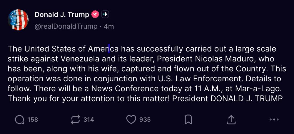 “Сполучені Штати Америки успішно провели великомасштабну операцію проти Венесуели та її лідера, президента Ніколаса Мадуро, який разом зі своєю дружиною був захоплений і вивезений з країни. Ця операція була проведена спільно з правоохоронними органами США. Подробиці будуть надані пізніше. Сьогодні об 11:00 відбудеться прес-конференція! Президент ДОНАЛЬД Дж. ТРАМП – Президент Трамп”.
