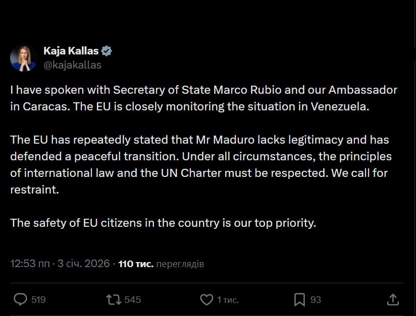 “Я поговорила з державним секретарем США Марко Рубіо і нашим послом у Каракасі. ЄС уважно стежить за ситуацією у Венесуелі. ЄС неодноразово заявляв, що пан Мадуро не має легітимності, і виступав за мирний перехідний період. За будь-яких обставин необхідно дотримуватися принципів міжнародного права та Статуту ООН. Ми закликаємо до стриманості. Безпека громадян ЄС у країні є нашим головним пріоритетом”, – йдеться у повідомленні.