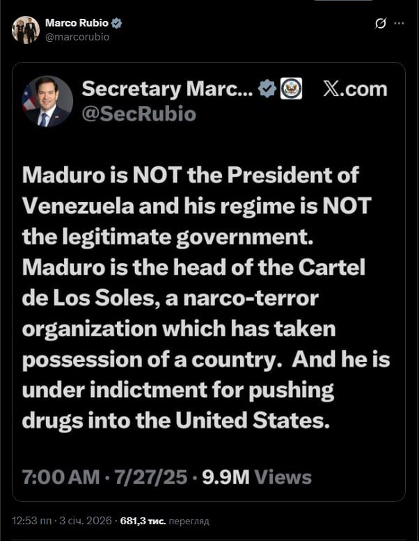 “Мадуро НЕ є президентом Венесуели, і його режим НЕ є легітимним урядом. Мадуро — глава Cartel de Los Soles, нарко-терористичної організації, що по суті захопила країну. І він перебуває під обвинуваченням у поширенні наркотиків у Сполучені Штати”, — держсекретар Сполучених Штатів Марко Рубіо в мережі Х зробив репост свого повідомлення від 27 липня 2025 року.