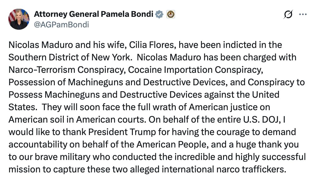 “Ніколаса Мадуро та його дружину Сілію Флорес було обвинувачено в Південному окрузі Нью-Йорка. Ніколасу Мадуро висунуто обвинувачення у змові з метою нарко-тероризму, змові з метою імпорту кокаїну, володінні кулеметами та вибуховими пристроями, а також у змові з метою володіння кулеметами та вибуховими пристроями проти Сполучених Штатів.